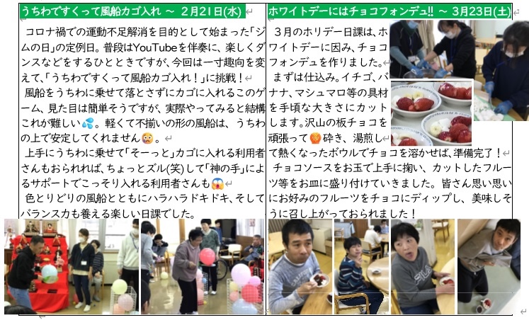 ~ 外部講師や内部スタッフによるルーティンの日課のほか、毎月第4土曜日を目安に実施する「ホリデー日課」。どんな企画で楽しんでもらうかは、担当となった職員の腕と知恵の見せどころ! 2月と3月のお題をまとめてご報告!(2月分は第4土曜日が不都合となったため平日に振替え)